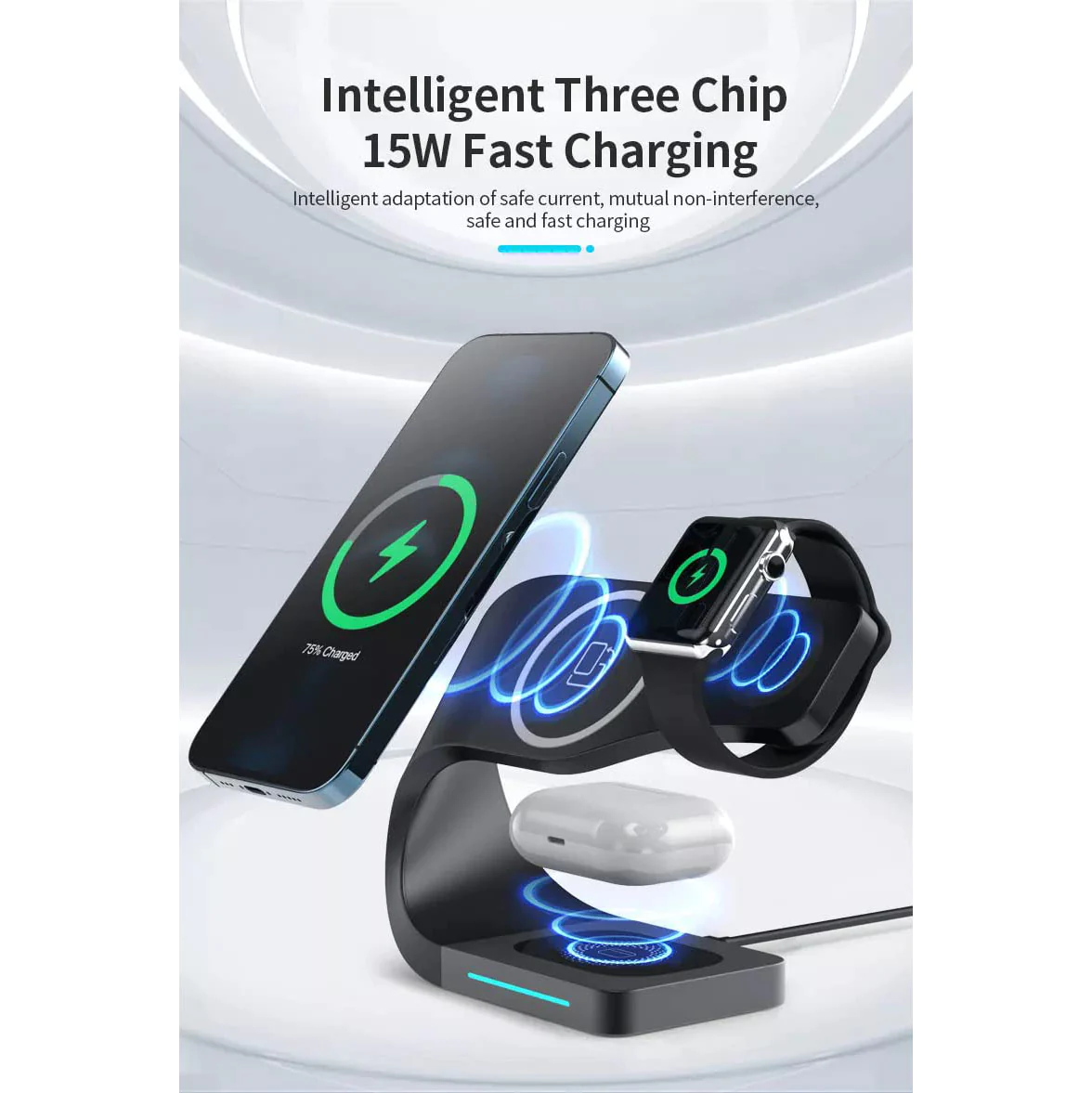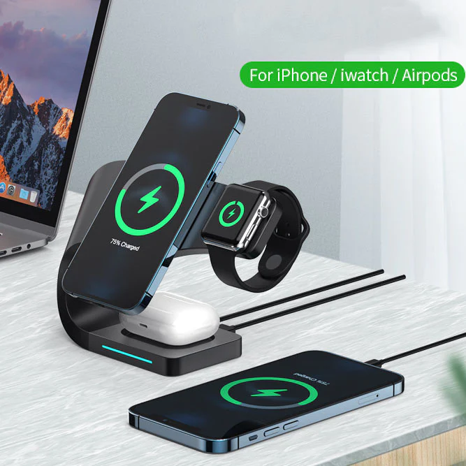 4-in-1 3 Chip 15 W Wireless Charging Station:The sleek and compact wireless charger stand provides three charging spots for three devices to charge at the same time plus fast charging out port. Say goodbye to the messy desktop or nightstand, making it simple to charge your iPhone, Apple Watch, and AirPods. Compatible with iPhone 14/14 plus/14 Pro/14 Pro Max 13/13 Mini/13Pro/13Pro max/12/12 Mini/12 Pro/12 Pro Max, iWatch Ultra/8/7/SE/6/5/4/3/2, AirPods 3/2 Pro/Pro 2.Works with MagSafe and Qi wireless charging.