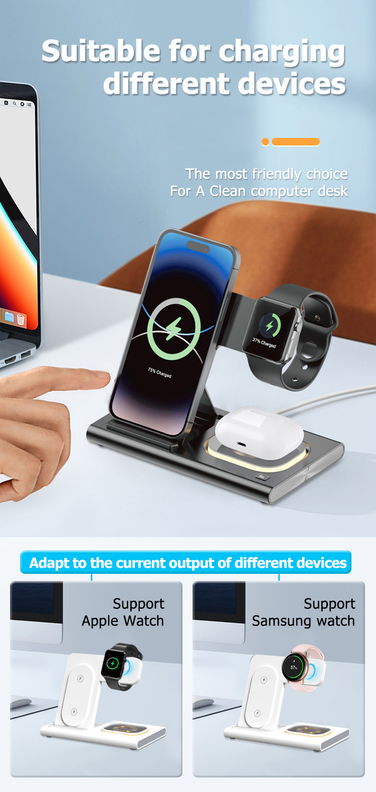 Safety and Security: wireless charger stand is Qi-compatible to ensure it’s safe and secure to charge your Qi-compatible devices. Built-in intelligent 3 chip chipset provides over-current, over-voltage, and over-temperature protection, safeguarding your devices while charging. Achieve efficient heat dissipation with massive heat emission holes at the bottom of the charging spots. Extra Security Protection.