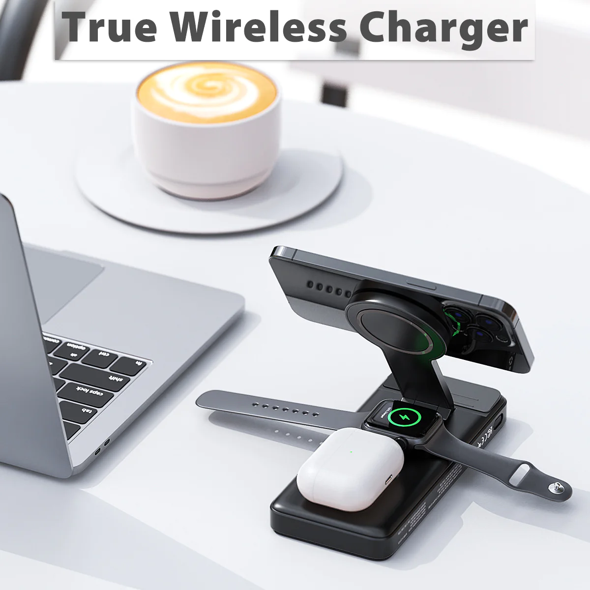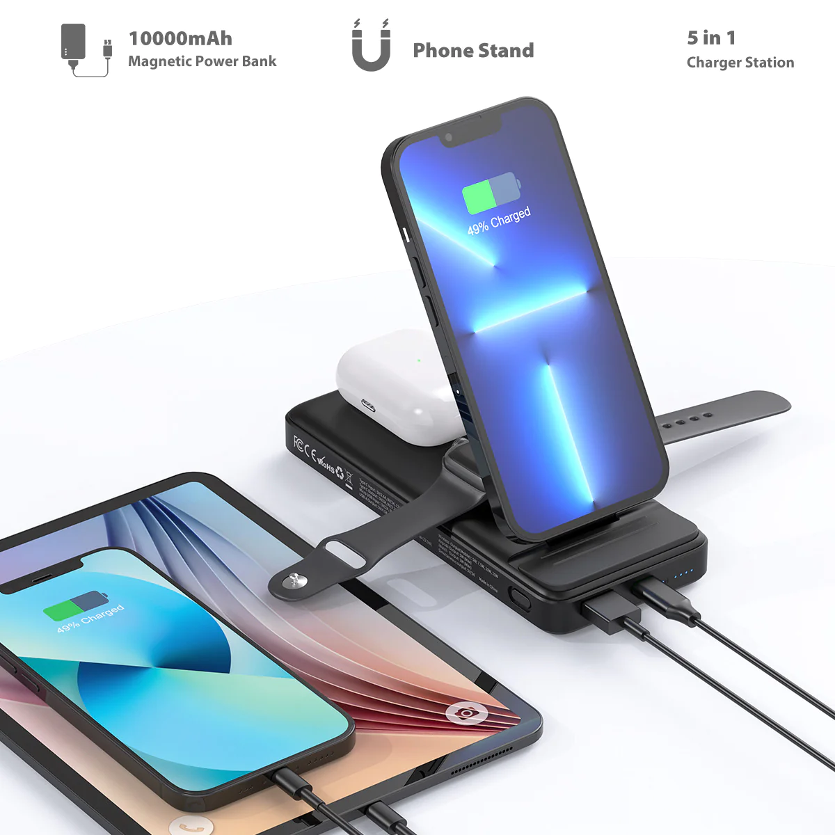 ๐ [Five-in-one Wireless Charger] Multi-functional magnetic suction bracket, the mobile phone can be adsorbed on the bracket to rotate 360 ยฐ, and the tilt angle of the bracket can be adjusted to 60 ยฐ. It is also suitable for wireless charging of mobile phones, earphones and watches.