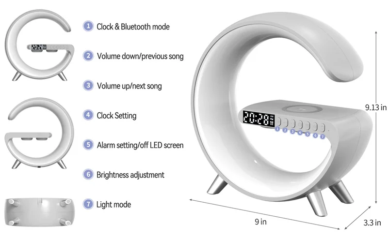 Audio, clock, alarm clock, 15W wireless charging Click the bulb button to switch between 10 light color modes (single color, dual color)