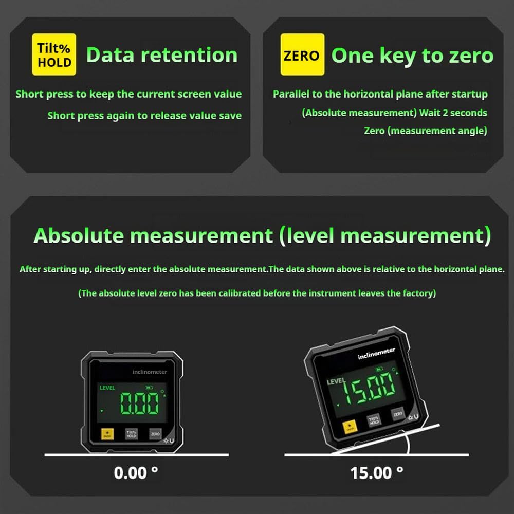 LED Display: Equipped with a large, clear LED display, this angle gauge provides real-time data visibility even in daylight. This feature improves work efficiency for both indoor and outdoor tasks, eliminating struggles with hard-to-read measurements under varying light conditions.