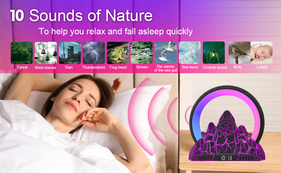 ✨The product has built-in white noise music to aid sleep: The product comes with 10 white noise music, which can help users relax their mind and fall asleep easily. (Early morning birds chirping, crickets chirping, frogs chirping, running water, Haiou chirping, rain sound, light rain + thunder, early morning comprehensive sound, lullaby 1, lullaby 2)。